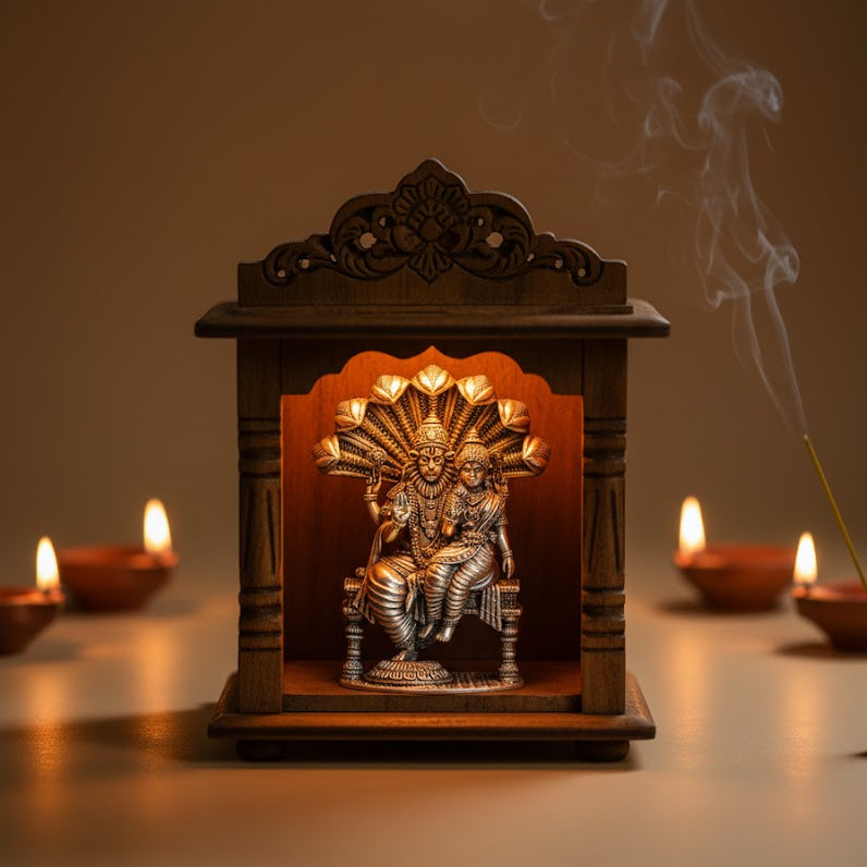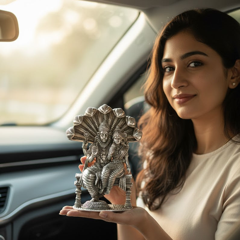 The antique silver-plated finish enhances its majestic aura, adding a timeless elegance that radiates purity and devotion. It is believed that worshipping Lakshmi Narasimha Swamy removes negativity, grants peace, and blesses devotees with prosperity and spiritual strength.