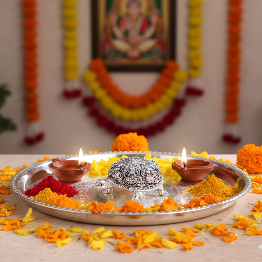 Invite divine prosperity and protection into your home with this beautifully designed Ashtalakshmi Tortoise Idol, elegantly silver plated for a radiant and auspicious look. This unique idol features the eight forms of Goddess Lakshmi — the Ashtalakshmi — seated gracefully on a sacred tortoise, symbolizing stability, longevity, and endless blessings.