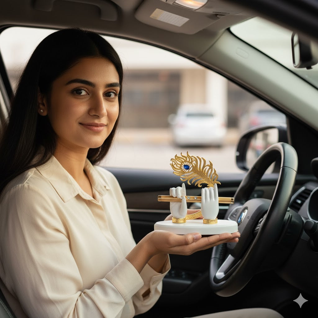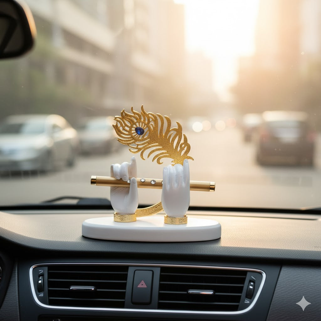 Perfect for your car dashboard, home temple, or office desk, it serves as a reminder of Krishna’s eternal message — to live with love, joy, and devotion. The graceful gold finish adds a luxurious and devotional touch to any space.