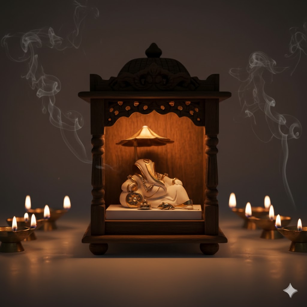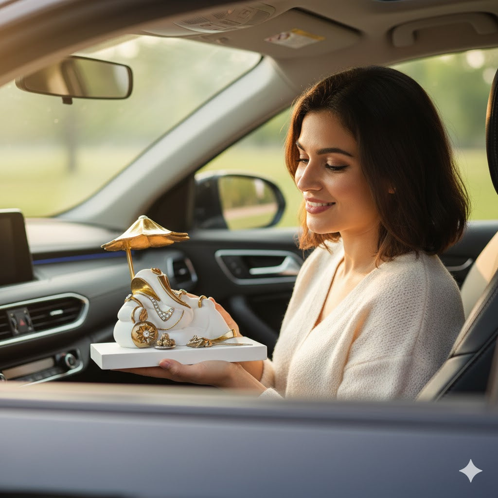 Beautifully designed, this idol features Lord Ganesha in a relaxed, resting posture under a graceful umbrella β symbolizing comfort, protection, and blessings. The elegant gold-plated finish enhances its divine aura, making it a perfect spiritual companion for your car dashboard, office desk, or home temple.